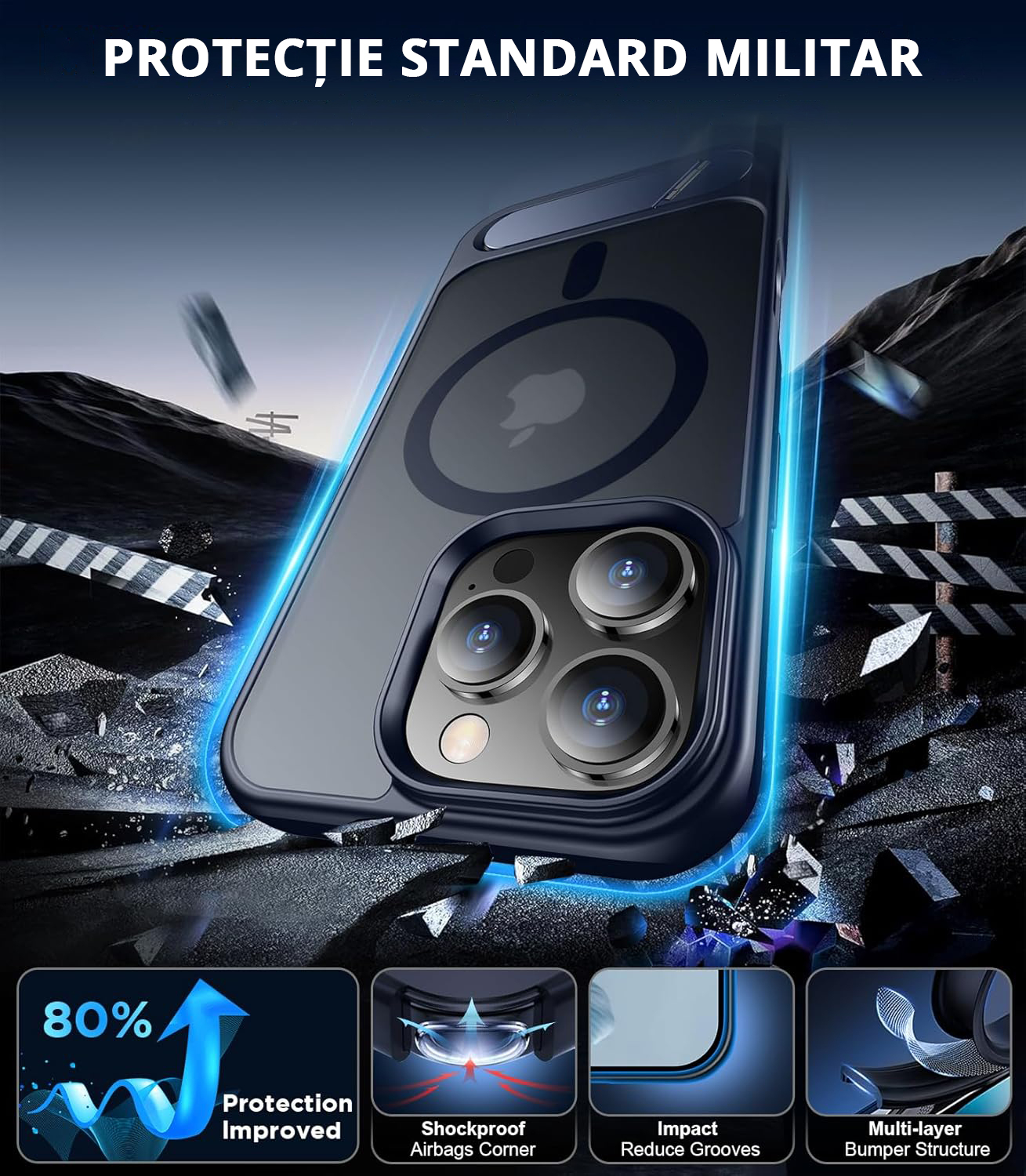 Husa iPhone 16 Pro Bleumarin cu MagSafe și Suport Metalic - Protecție Militară Antișoc