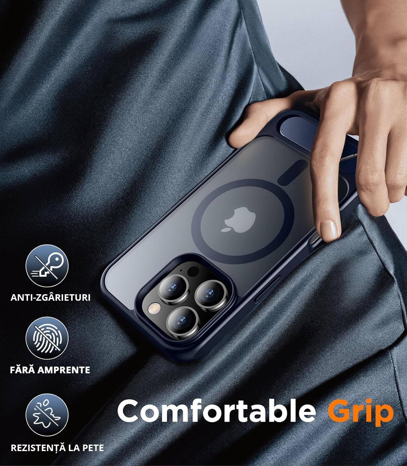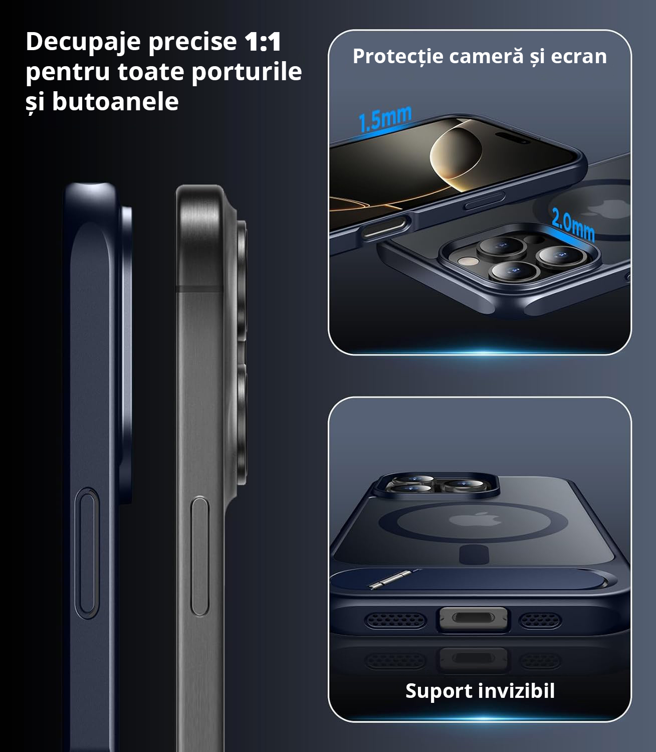 Cadrul bleumarin adaugă o notă sofisticată, în timp ce spatele semi-transparent permite vizibilitatea logo-ului Apple. Textura mată reduce amprentele și zgârieturile, păstrând aspectul impecabil al telefonului tău.